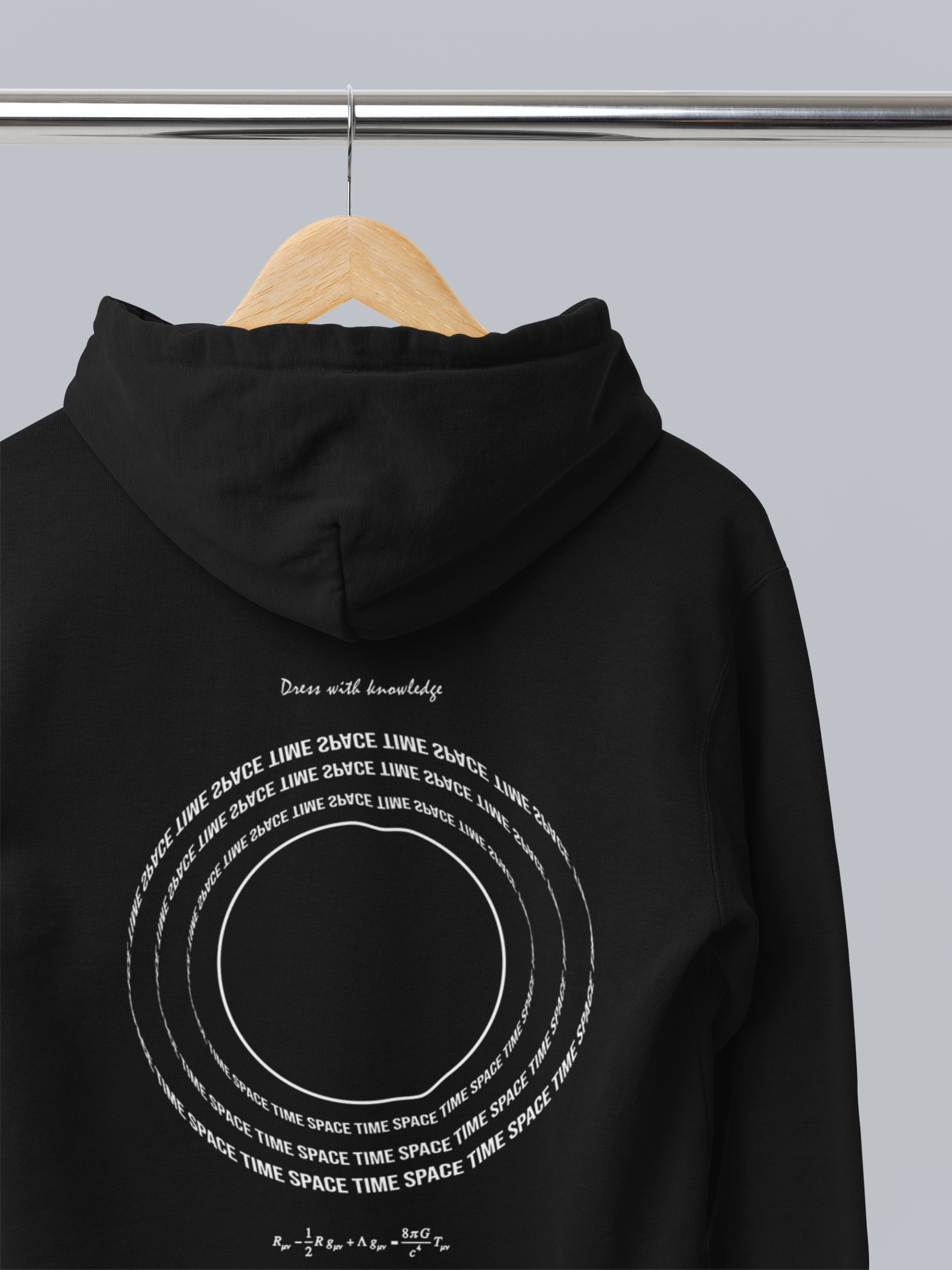 Inspirada en la deformación del espacio-tiempo alrededor de un agujero negro, esta sudadera captura la esencia de las fuerzas invisibles que moldean nuestro universo.